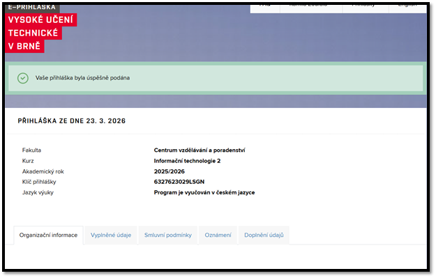 Po dokončení a úspěšném odeslání přihlášky se uživateli zobrazí potvrzující text „Vaše přihláška byla úspěšně podána“.