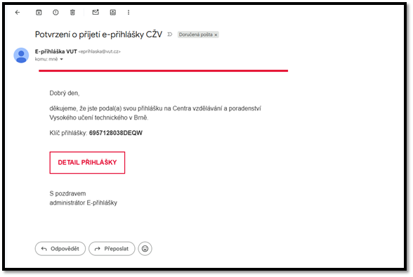 Současně je automaticky zaslán potvrzovací e‑mail s klíčem přihlášky.